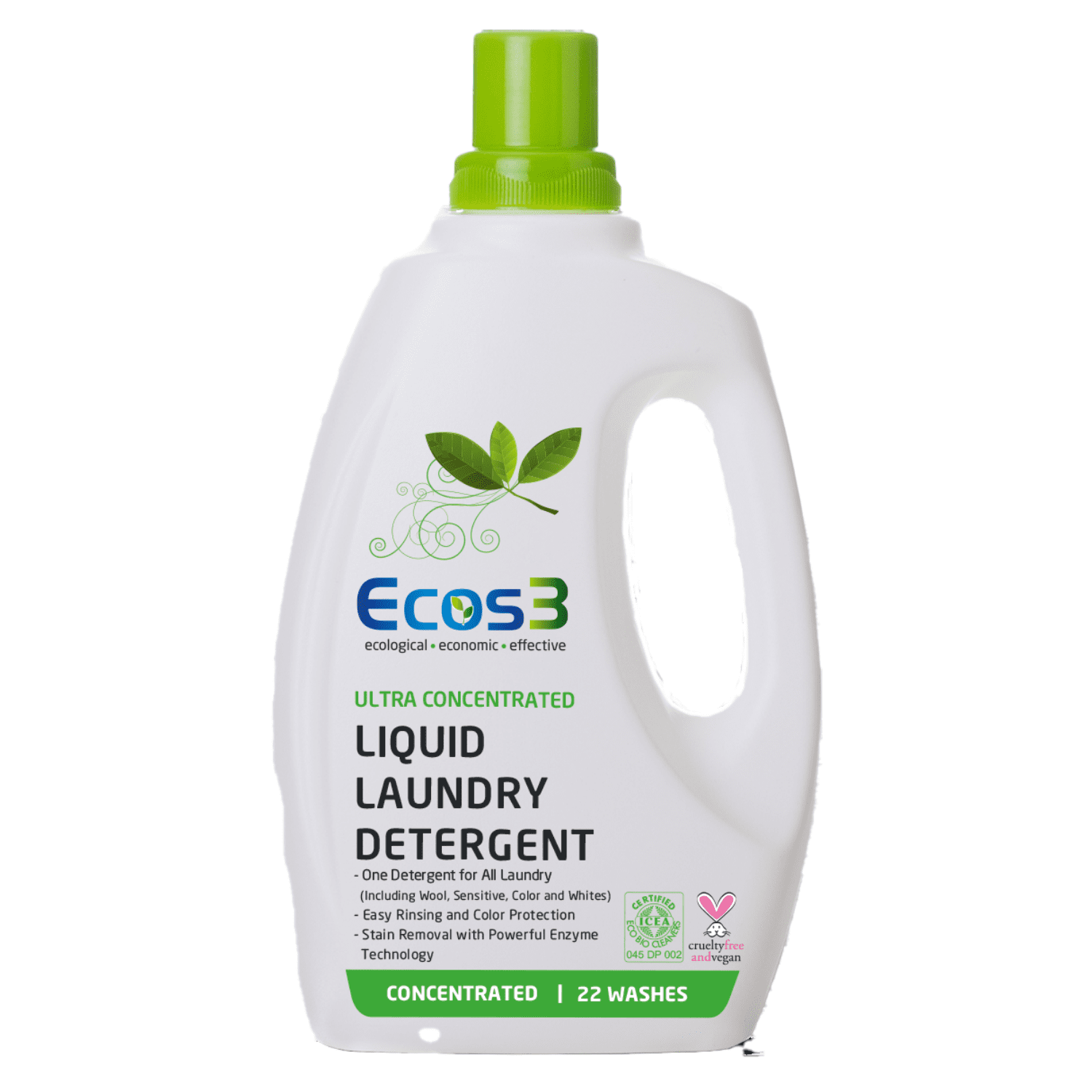Ecos3 Bio-Waschmittel: Es ist ein natürliches, veganes und pflanzliches Waschmittel, das keine schädlichen Chemikalien enthält. Es ist von ICEA (Ethical and Environmental Certification Institute – ITALY), einer der vertrauenswürdigsten Zertifizierungsorganisationen in Europa, als biologisch zertifiziert. Ecos3 Bio-Waschmittel ist ein natürliches Produkt, das von der PeTA als vegan und frei von Grausamkeiten zertifiziert wurde. Weder das Produkt selbst noch die darin verwendeten Inhaltsstoffe wurden an Tieren getestet.