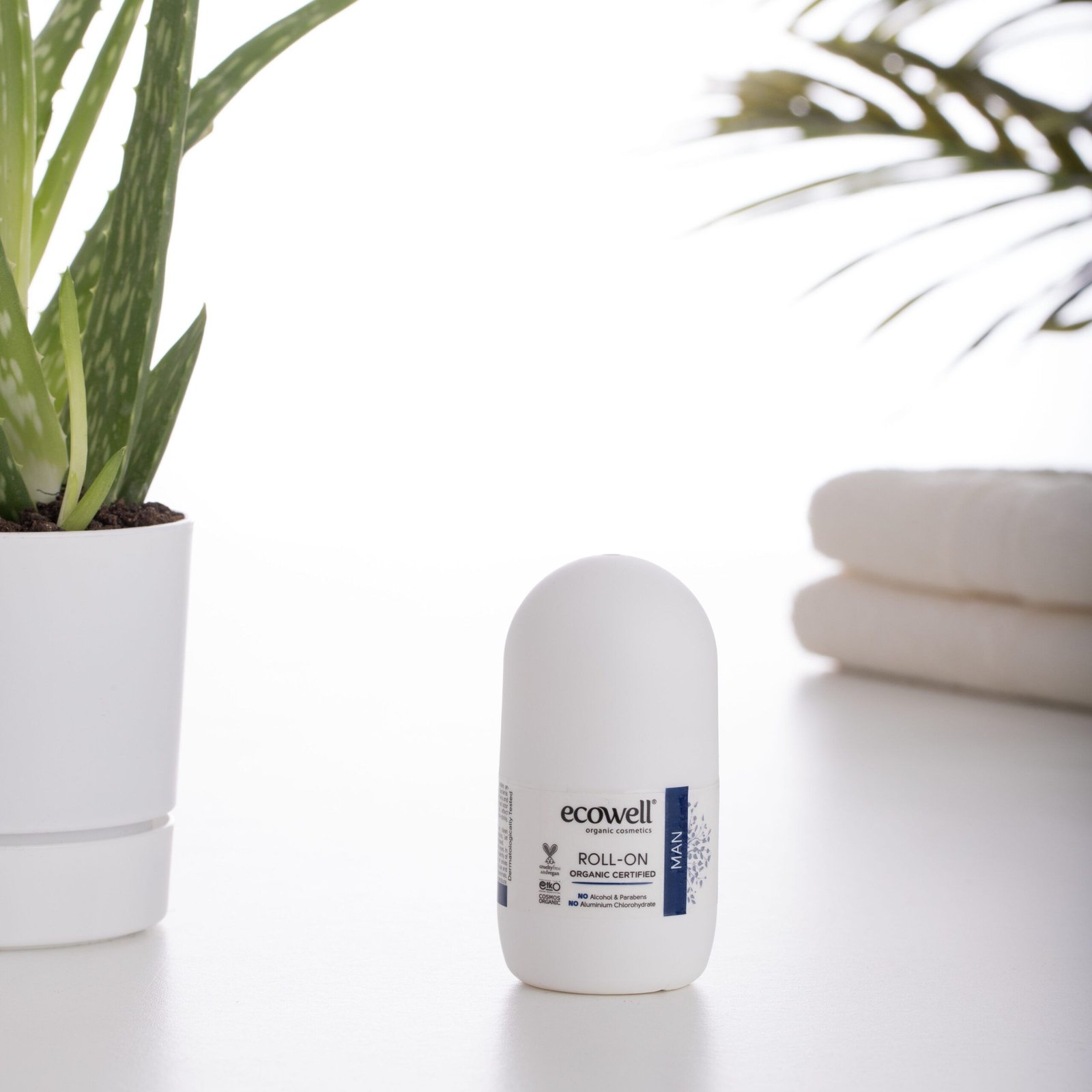 Ecowell Bio-Roll-on Männer ist ein natürliches Deodorant, das Ihre Haut schützt und erfrischt. Es enthält Bio-Myrtensaft, Bio-Aloe Vera und Kaliumalaun, ein natürliches Mineralsalz, das geruchsbildende Bakterien bekämpft. Es verhindert nicht das Schwitzen, sondern beseitigt unangenehme Gerüche. Es ist frei von Alkohol, Aluminiumsalzen, Parabenen und synthetischen Duftstoffen. Es ist für alle Hauttypen geeignet und dermatologisch getestet. Es hat einen angenehmen, holzigen Duft, der Ihnen ein Gefühl von Frische und Sauberkeit verleiht.